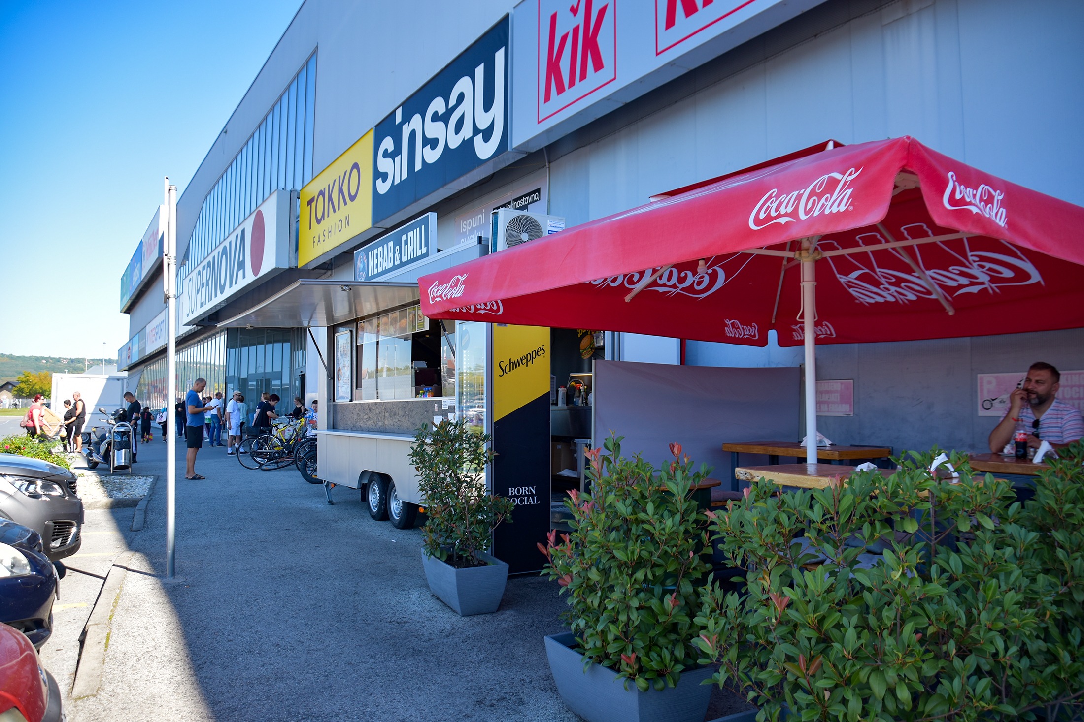 Street food Merlin je smješten na istočnom dijelu Slavonskog Broda ispred glavnog ulaza u trgovački centar SuperNova.