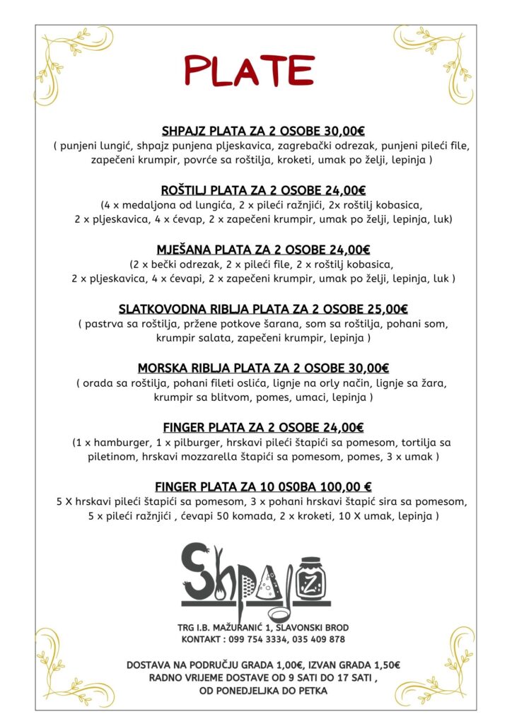Kako bismo vam olakšali uživanje u našim specijalitetima, nudimo uslugu dostave na području grada i izvan njega. Također, ako planirate proslavu ili poslovni događaj, naš catering tim je tu da se pobrine za sve vaše potrebe, omogućujući vam da se opustite i uživate sa svojim gostima. Hranu možete naručiti i preko aplikacije Wolt!