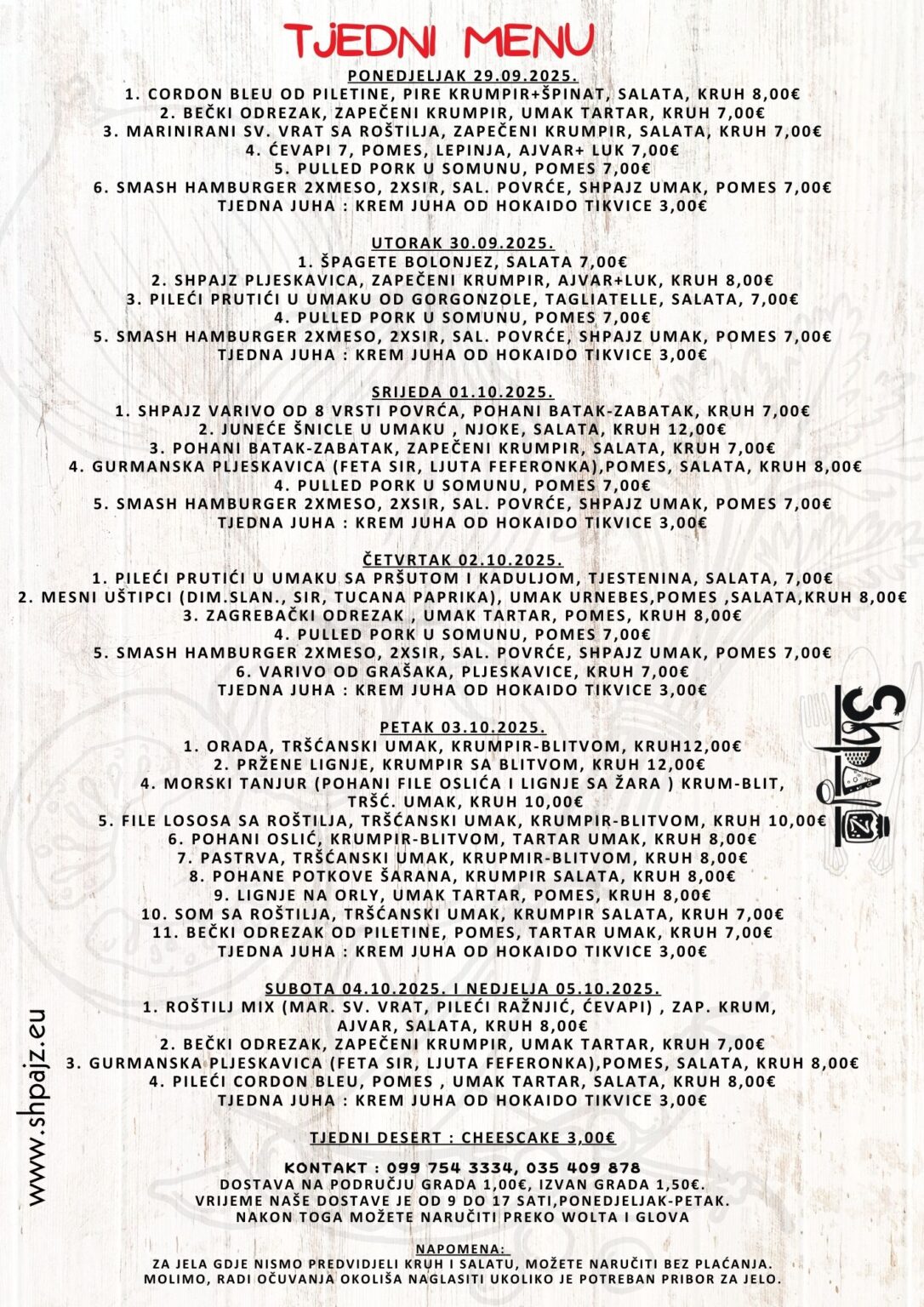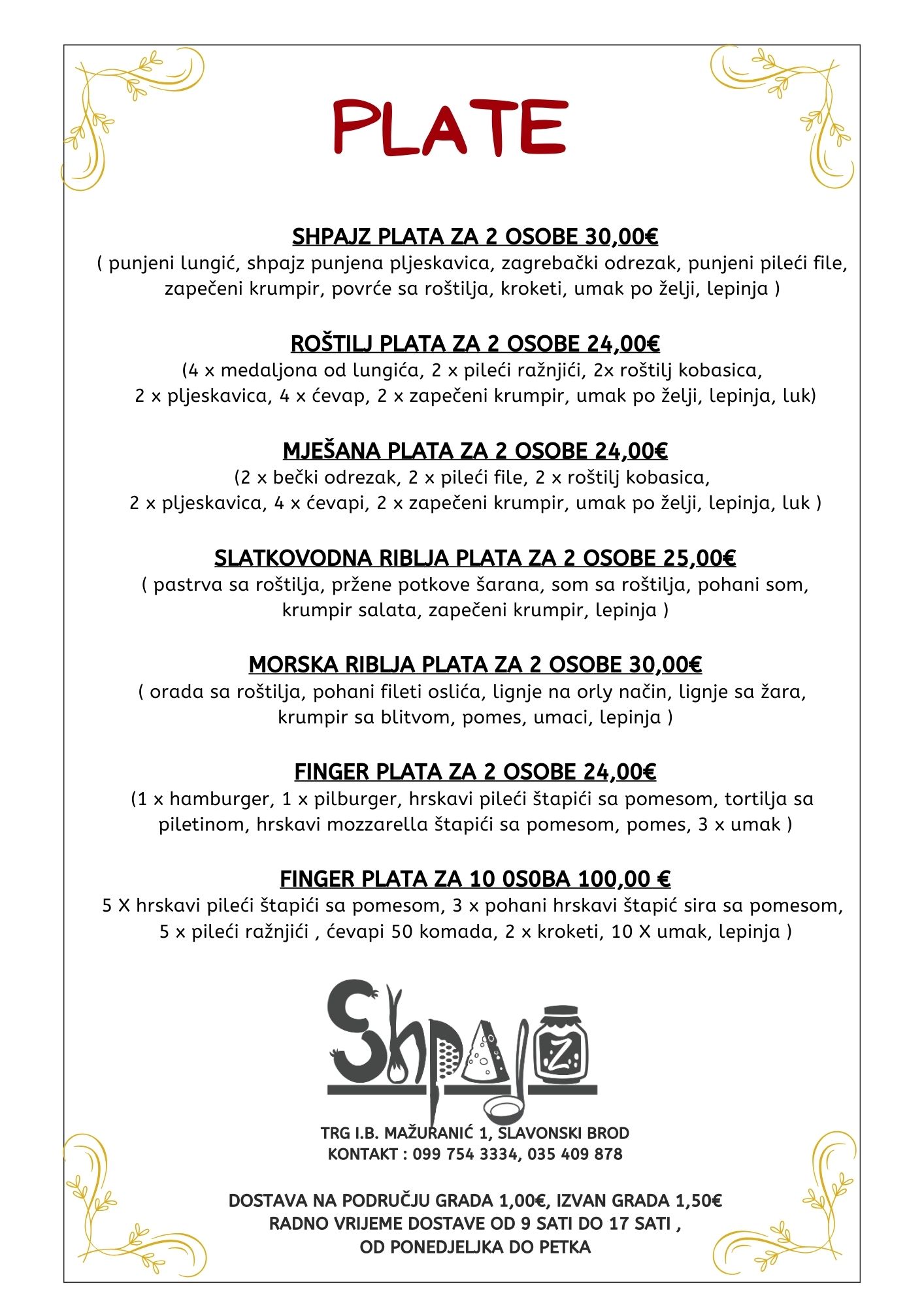 Kako bismo vam olakšali uživanje u našim specijalitetima, nudimo uslugu dostave na području grada i izvan njega. Također, ako planirate proslavu ili poslovni događaj, naš catering tim je tu da se pobrine za sve vaše potrebe, omogućujući vam da se opustite i uživate sa svojim gostima. Hranu možete naručiti i preko aplikacije Wolt!