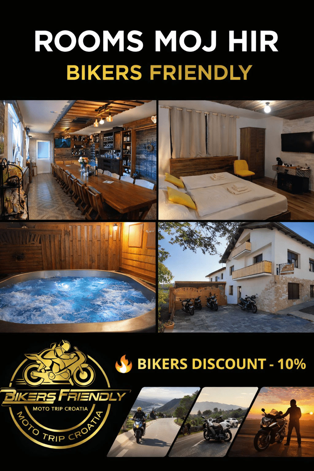Za motocikliste smo Biker-friendly lokacija – osiguravamo privatni parking za više motocikala, a svim bikerima odobravamo 10% popusta na naše ture.